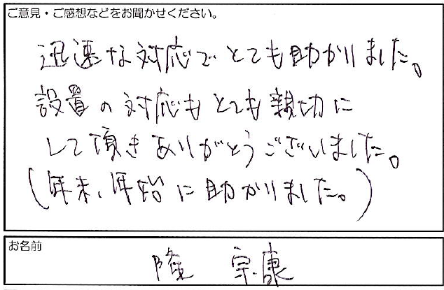 迅速な対応でとても助かりました。 設置の対応もとても親切に して頂きありがとうございました。 (年末、年始に助かりました。)