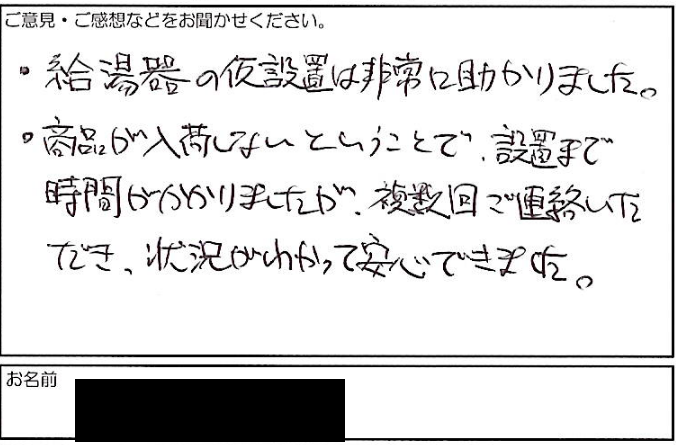 2022.02.01 お客様の声 西宮市 匿名様 ・給湯器の仮設置は非常に助かりました。 ・商品が入荷しないということで、設置まで 時間がかかりましたが、複数回ご連絡いた だき、状況がわかって安心できました。