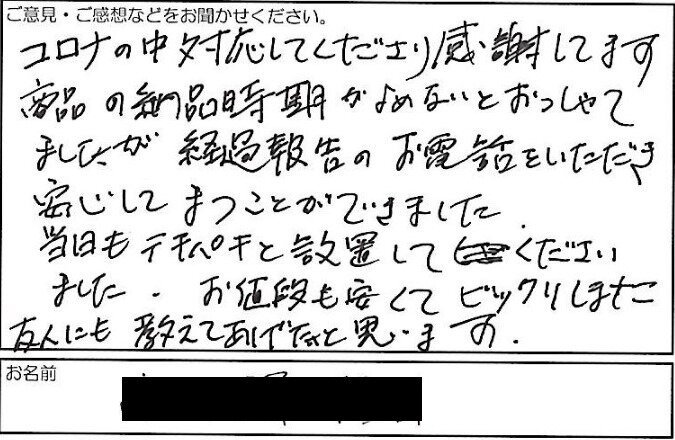 2022.02.16 お客様の声 伊丹市 匿名様 コロナの中対応してくださり感謝してます 商品の納期時期がよめないとおっしゃって ましたが経過報告のお電話いただき 安心してまつことができました。 当日もテキパキと設置してくださり ました。お値段も安くてビックリしました。 友人にも教えてあげたいと思います。