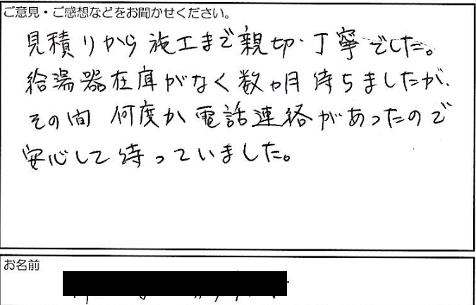見積もりから施工まで親切・丁寧でした。 給湯器在庫がなく数ヶ月待ちましたが、 その間 何度か電話連絡があったので 安心して待ってました。