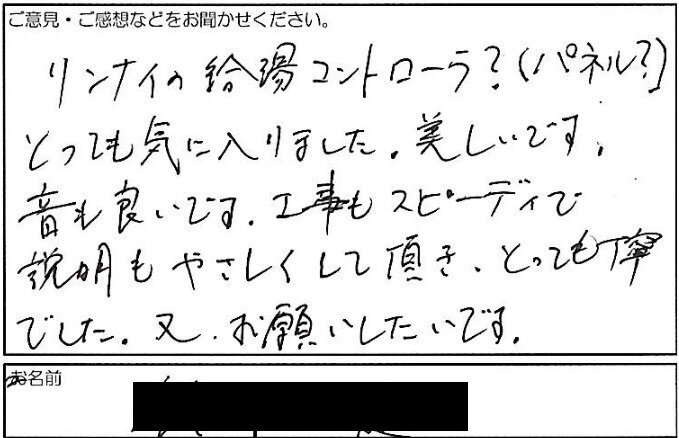2022.03.10 お客様の声 東灘区 匿名様 リンナイの給湯コントローラー?(パネル?) とっても気に入りました。美しいです。 音も良いです。工事もスピーディで 説明もやさしくして頂き、とっても丁寧 でした。又、お願いしたいです。