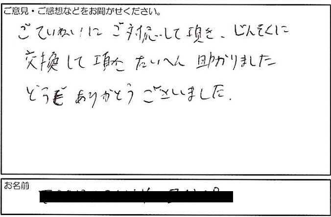 ごていねいにご対応して頂き、じんそくに 交換して頂きたいへん助かりました どうもありがとうございました。