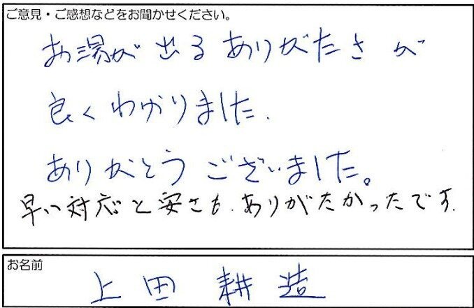 お湯が出るありがたさが 良くわかりました。 ありがとうございました。 早い対応と安さも、ありがたかったです。