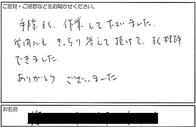 手際よく作業して下さいました。 質問にもきっちり答えて頂けて、よく理解 できました。 ありがとう ございました