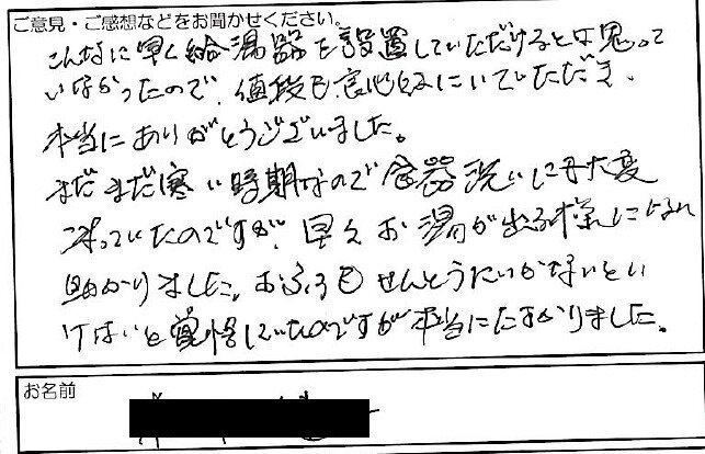 2022.04.01 お客様の声 伊丹市 匿名様 こんなに早く給湯器を設置していただけるとは思って いなかったので、値段も良心的にしていただき、 本当にありがとうございました。 まだまだ寒い時期なので食器洗いにも大変 こまっていたのですが、早々お湯が出る様になり 助かりました。おふろもせんとうにいかないとい けないと覚悟していたのですが本当に助かりました。