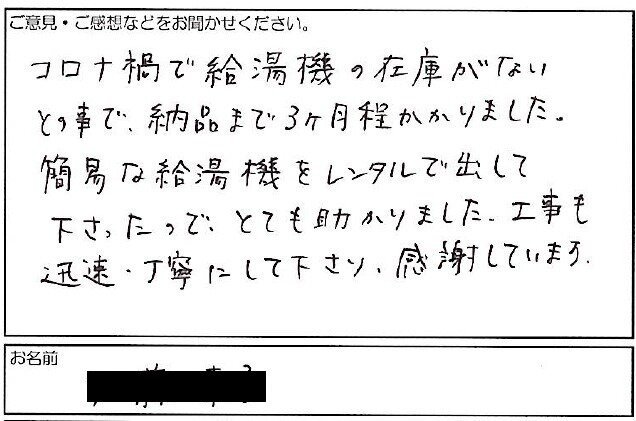 2022.04.01 お客様の声 神戸市 K様 コロナ禍で給湯機のざいこがない との事で、納品まで3ヶ月程かかりました。 簡易な給湯機をレンタル出だして 下さったのでとても助かりました。工事も 迅速・丁寧にしてくださり、感謝しています。