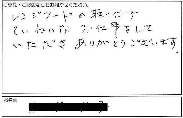 レンジフードの取り付け ていねいなお仕事をして いただきありがとうございます。