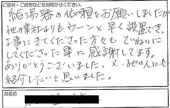 2022.04.01 お客様の声 兵庫区 匿名様 給湯機の依頼をおねがいしましたが 他の業者よりもウーンと早く設置でき、 工事に来てくださった方々もていねいに してくださった事に感謝してます。 ありがとうございました。又、他の人にも 紹介したいと思いました。