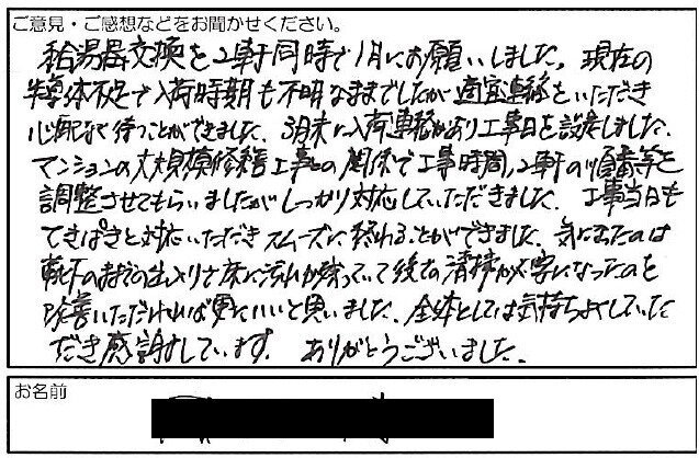 2022.04.01 お客様の声 宝塚市 匿名様 給湯機交換を2軒同時で1月にお願いしました。現在の 半導体不足で入荷時期も不明なままでしたが適宜連絡をいただき 心配なく待つことができました。3月末に入荷連絡があり工事日を設定しました。 マンションの丈規模修繕工事との関係で工事時間、2軒の順番等を 調整させてもらいましたがしっかり対応していただきました。工事当日も てきぱき対応いただきスムーズに終わることが出来ました。気になったのは 靴下のままでの出入りで床に汚れが残っていて後での清掃が必要になったのを 改善いただければ更にいいと思いました。全体としては気持ちよくしていた だき感謝しています。ありがとうございました。