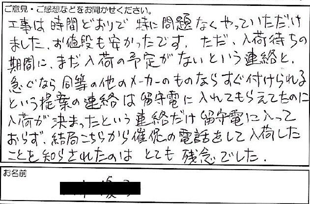 2022.04.01 お客様の声 宝塚市 匿名様 工事は時間どおりで特に問題なくやっていただけ ました。お値段も安かったです。ただ、入荷待ちの 期間に、まだ入荷がない連絡と、 急ぐなら同等の他のメーカーのものならすぐ付けられる という提案の連絡だけ留守電に入って おらず、結局こちらから最速の電話をして入荷した ことを知らされたのはとても残念でした。