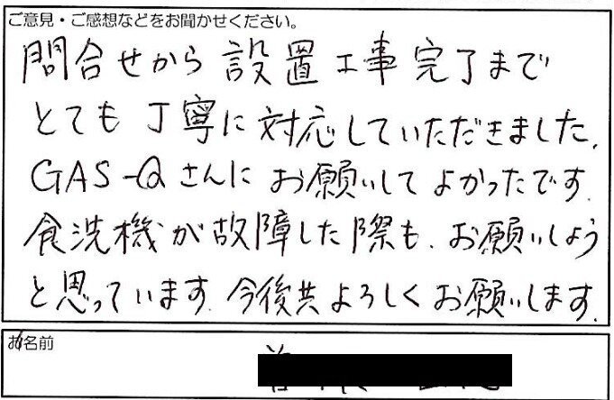 2022.04.01 お客様の声 神戸市中央区 匿名様 問い合わせから設置工事完了まで とても丁寧に対応していただきました GAS-Qさんにお願いしてよかったです。 食洗機が故障した際も、お願いしよう と思っています。今後共よろしくお願いします。