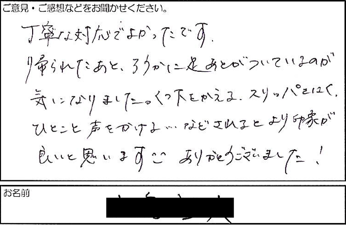 2022.04.08 お客様の声 宝塚市 匿名様 丁寧な対応でよかったです。 帰られたあと、ろうかに足あとがついているのが 気になりました。くつ下をかえる、スリッパをはく、 ひとこと声をかける・・・などされるとより印象が 良いと思います。ありがとうございました!