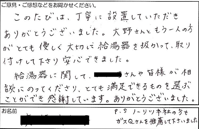 2022.04.08 お客様の声 西宮市 匿名様 このたびは、丁寧に設置していただき ありがとうございました。大野さんともう一人の方 がとても優しく大切に給湯器を扱って、取り 付けて下さり安心できました。 給湯器に関して、スタッフさんや皆様が相 談にのってくださり、とても満足できるものを選ぶ ことができ感謝しています。ありがとうございました。 P.S ノーリツ本社の方もガスQさんを推薦して下さいました