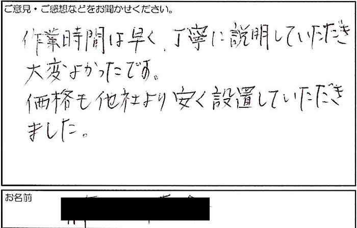 作業時間は早く、丁寧に説明していただき 大変よかったです。 価格も他社より安く設置していただき ました。