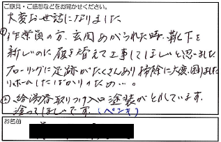 2022.04.14 お客様の声 西宮市 匿名様 大変お世話になりました ①作業員の方、玄関上がられた時、靴下を 新しいのに履き替えてほしいとお思いました。 フローリングに足跡がたくさんあり掃除に大変困りました リホームしたばかりのため...。 ②給湯器取りつけ入口塗装がとれています。 塗ってほしいです。(ペンキ)