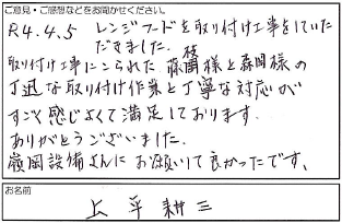 2022.04.14 お客様の声 長田区 上平様 R4.4.5 レンジフードを取り付け工事をしていた だきました。 取り付け工事にこられた藤枝様と森岡様の 迅速な取り付け作業と丁寧な対応が すごく感じよくて満足しております。 ありがとうございました。 嶺岡設備さんにお願いして良かったです。