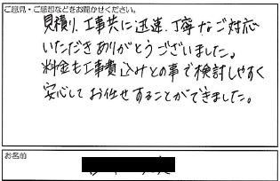見積もり、工事共に迅速・丁寧なご対応 頂きありがとうございました。 料金も工事費込みとの事で検討しやすく 安心してお任せすることができました。