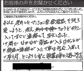 2022.04.14 お客様の声 芦屋市 匿名様 10年以上 使用したマンション型給湯器、そろそろ 交換しようと、考え ちょうどチラシ が入ってすぐ注文しました。 コロナ禍でなかなか商品が入らなかったが 途中 経過の連絡が入り、丁寧な対応、入荷して すぐに取り付、どこよりも安く設置出来たと思います