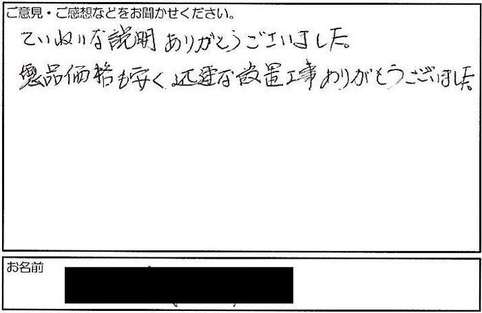ていねいな説明ありがとうございました。 製品価格も安く、迅速な設置工事ありがとうございました。