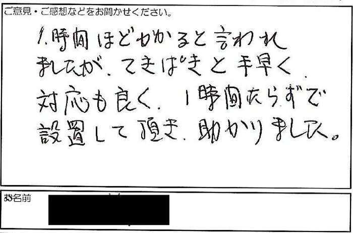 1時間ほどかかると言われ ましたが、てきぱきと手早く 対応も良く、1時間たらずで 設置して頂き、助かりました。