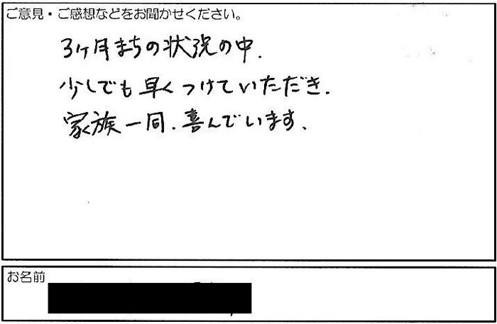 3ヶ月まちの状況の中、 少しでも早くつけていただき、 家族一同、喜んでいます。