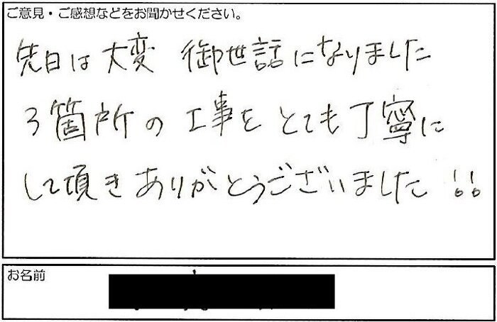 先日は大変御世話になりました 3箇所の工事をとても丁寧に して頂きありがとうございました!!