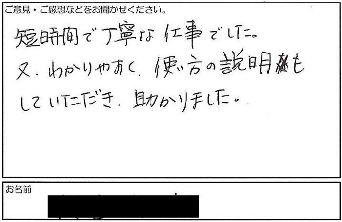 短時間で丁寧な仕事でした。 又、わかりやすく、使い方の説明も していただき、助かりました。