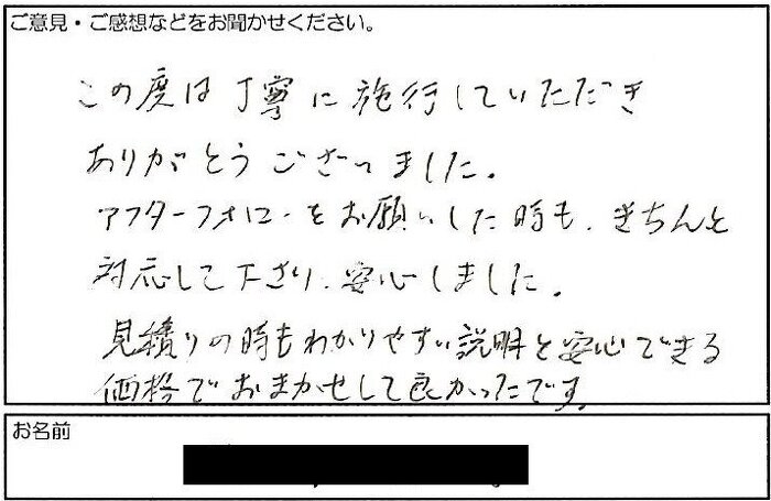 2022.05.12 お客様の声 明石市 匿名様 この度は丁寧に施行していただき ありがとうございました。 アフターフォローをお願いした時も、きちんと 対応して下さり、安心しました。 見積りの時もわかりやすく説明と安心できる 価格でおまかせして良かったです。