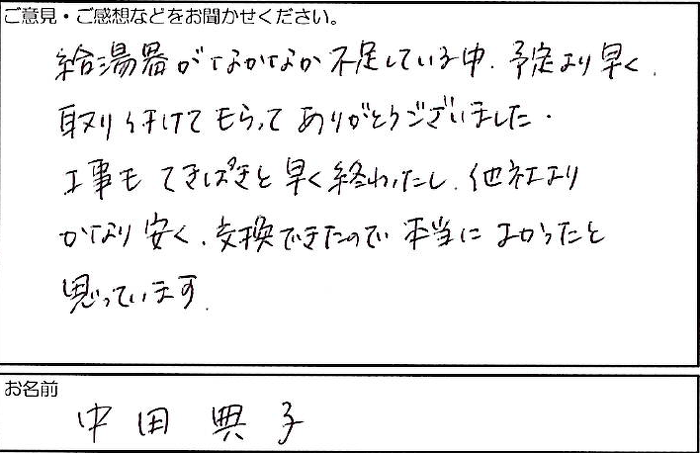 2022.05.31 お客様の声 大阪市城東区 中田様 給湯器がなかなか不足している中、予定より早く 取り付けてもらってありがとうございました。 工事もてきぱきと早く終わったし、他社より かなり安く、交換出来たので本当によかったと 思っています。
