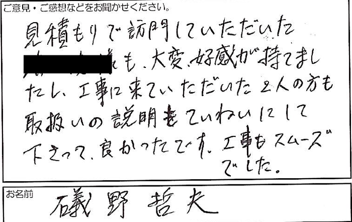 2022.05.31 お客様の声 西宮市 磯野様 見積もりで訪問していただいた スタッフも、大変、好感が持てまし たし、工事に来ていただいた2人の方も 取扱いの説明もていねいにして 下さって、良かったです。工事もスムーズでした。