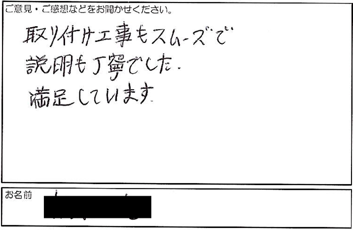 取り付け工事もスムーズで 説明も丁寧でした。 満足しています。