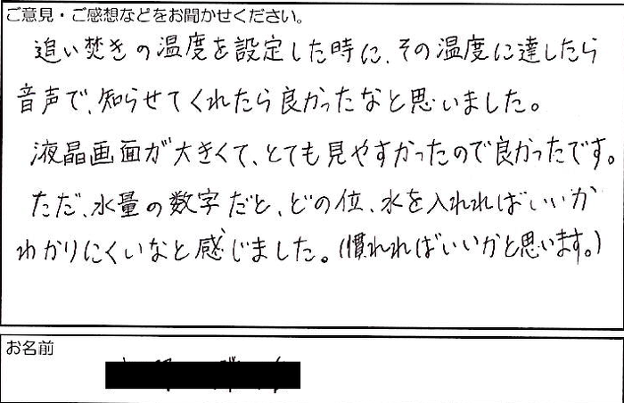 2022.05.31 お客様の声 神戸市 匿名様 追い焚きの温度を設定した時に、その温度に達したら 音声で、知らせてくれたら良かったなと思いました。 液晶画面が大きくて、とても見やすかったので良かったです。 ただ、水量の数字だと、どの位、水を入れればいいか わかりにくいなと感じました。(慣れればいいかと思います。)