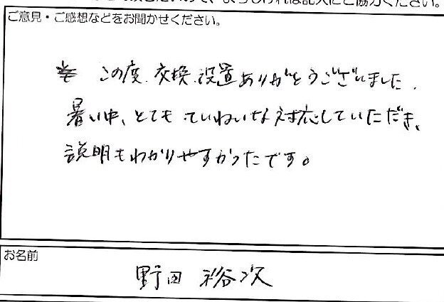 この度、交換・設置ありがとうございました。 暑い中、とても、ていねいな対応していただき 説明もわかりやすかったです。