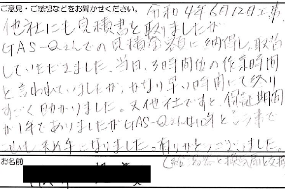 2022.06.28 お客様の声 神戸市 匿名様 令和4年6月12日工事 他社にも見積書を取りましたが GAS-Qさんでの見積もり金額に納得し、取替 していただきました。当日、3時間位の作業時間 と言われていましたが、かなり早い時間にて終わり すごく助かりました。又他社ですと、保証期間 が1年でありましたがGAS-Qさんは10年と言う事で これも、決め手になりました。有りがとうございました。 (給湯器と換気扇を交換)