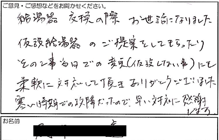 2022.06.28 お客様の声 神戸市 匿名様 給湯器交換の際お世話になりました 仮設給湯器のご提案をしてもらったり その工事当日での変更(仮設しない事)にも 柔軟に対応して頂きありがとうございました 寒い時期での故障だったので、早い対応に感謝します。