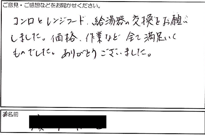 コンロとレンジフード、給湯器の交換をお願い しました。価格、作業など全て満足いく ものでした。ありがとうございました。