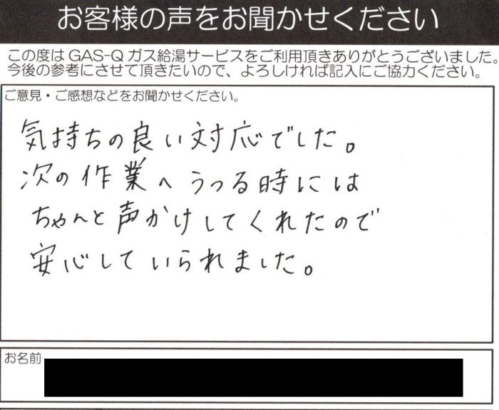 気持ちの良い対応でした。 次の作業へうつる時には ちゃんと声がけしてくれたので 安心していられました。