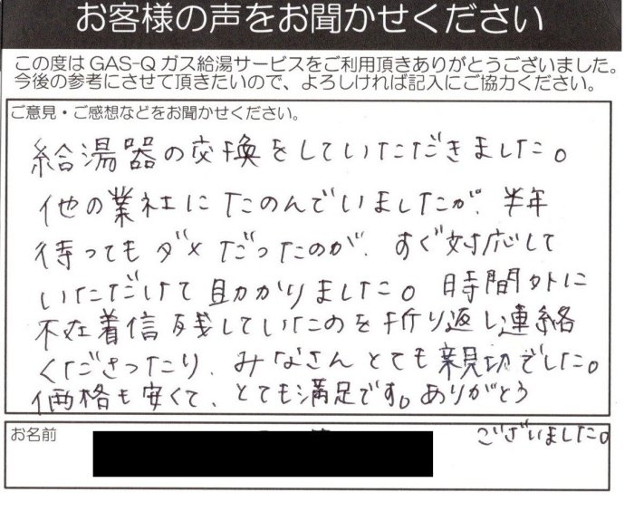2022.08.14 お客様の声 大阪市西淀川区匿名様 給湯器の交換をしていただきました。 他の業社にたのんでいましたが、半年 待ってもダメだったのが、すぐ対応して いただけて助かりました。時間外に 不在着信残していたのを折り返し連絡 くださったり、みなさんとても親切でした。 価格も安くて、とても満足です。ありがとうございました。