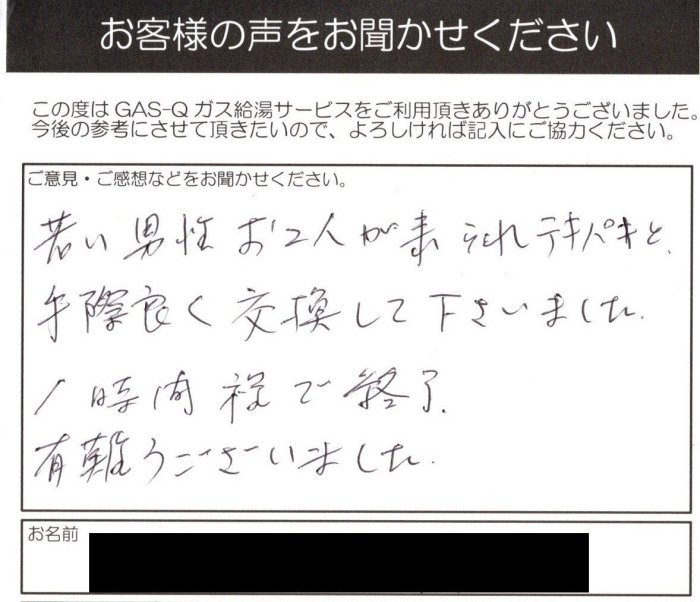 若い男性お二人が来られテキパキと、 手際良く交換して下さいました。 1時間程で終了。 ありがとうございますした。